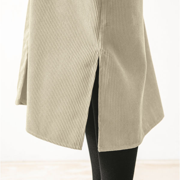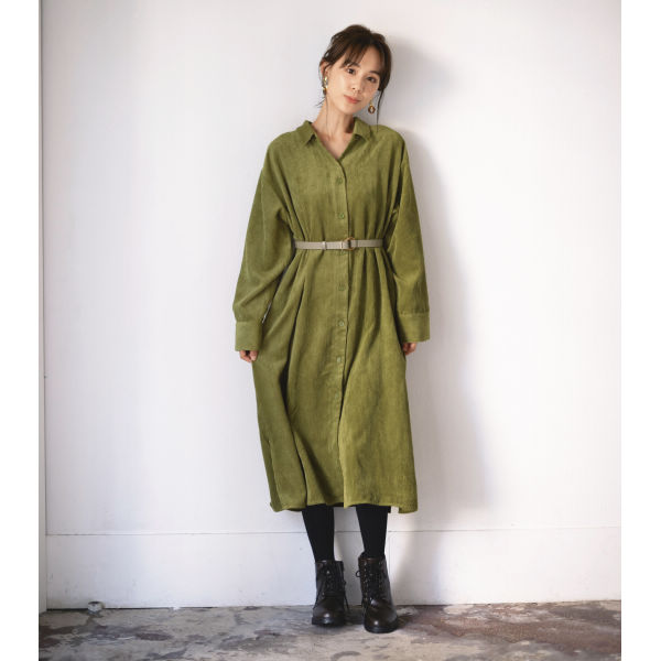 トレンドのコーデュロイ素材を使用したロングシャツワンピース。ゆったりとしたサイズ感で羽織りとしても着用でき、スタイリングの幅が広がる一枚。