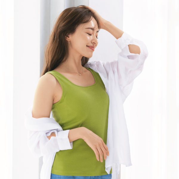 ゴムの締め付けがなくて、バストの綺麗なラインで、着心地よくて、インナーではなくアウターとして1枚でも着れる・・・そんな女子のワガママ叶えるブラトップ。身生地は伸びの良い、ウレタン混のリブ素材。女性のデコルテラインを綺麗に見せるスクエアネックです。