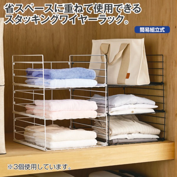 省スペースに重ねて使用できるスタッキングワイヤーラック。押入れ・クローゼット内の衣類はもちろんタオルや小物などの収納にもおすすめ。A4サイズの書類もラクラク置けて、文具などオフィス内の収納にも便利なラックです!