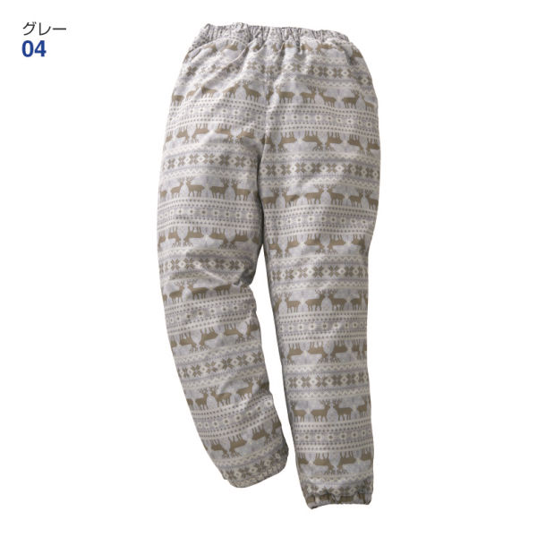 男女兼用ウエスト総ゴム(ヒモ付)前/左右ポケット×各1手洗い蓄熱中綿※(04)グレーは総柄です。
