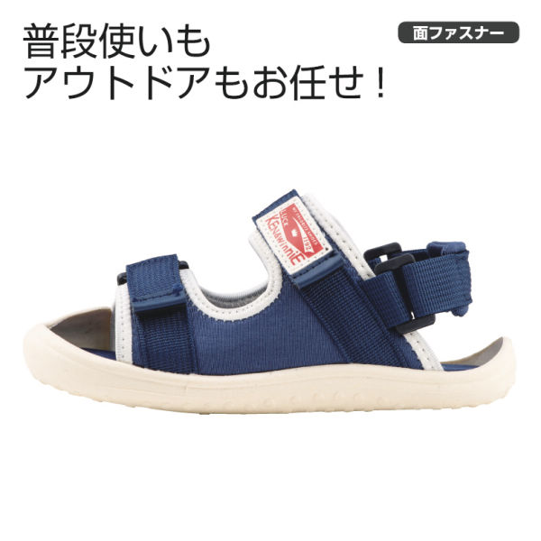 普段使いもアウトドアもお任せ!子どもの足を守るやさしさ満載の安心設計。つま先とかかとの飛び出しを防ぐ安心設計のソール。