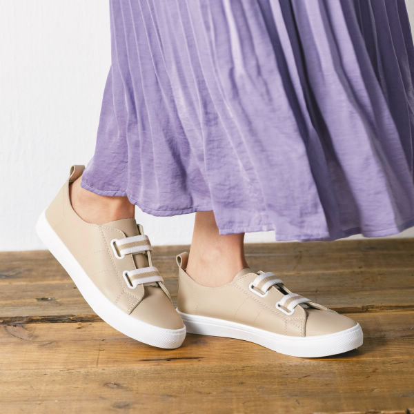 ダブルゴムベルトで脱ぎ履きしやすいリラックススニーカー。つま先からかかとまでやわらかいアッパーで足にやさしい履きごこち。